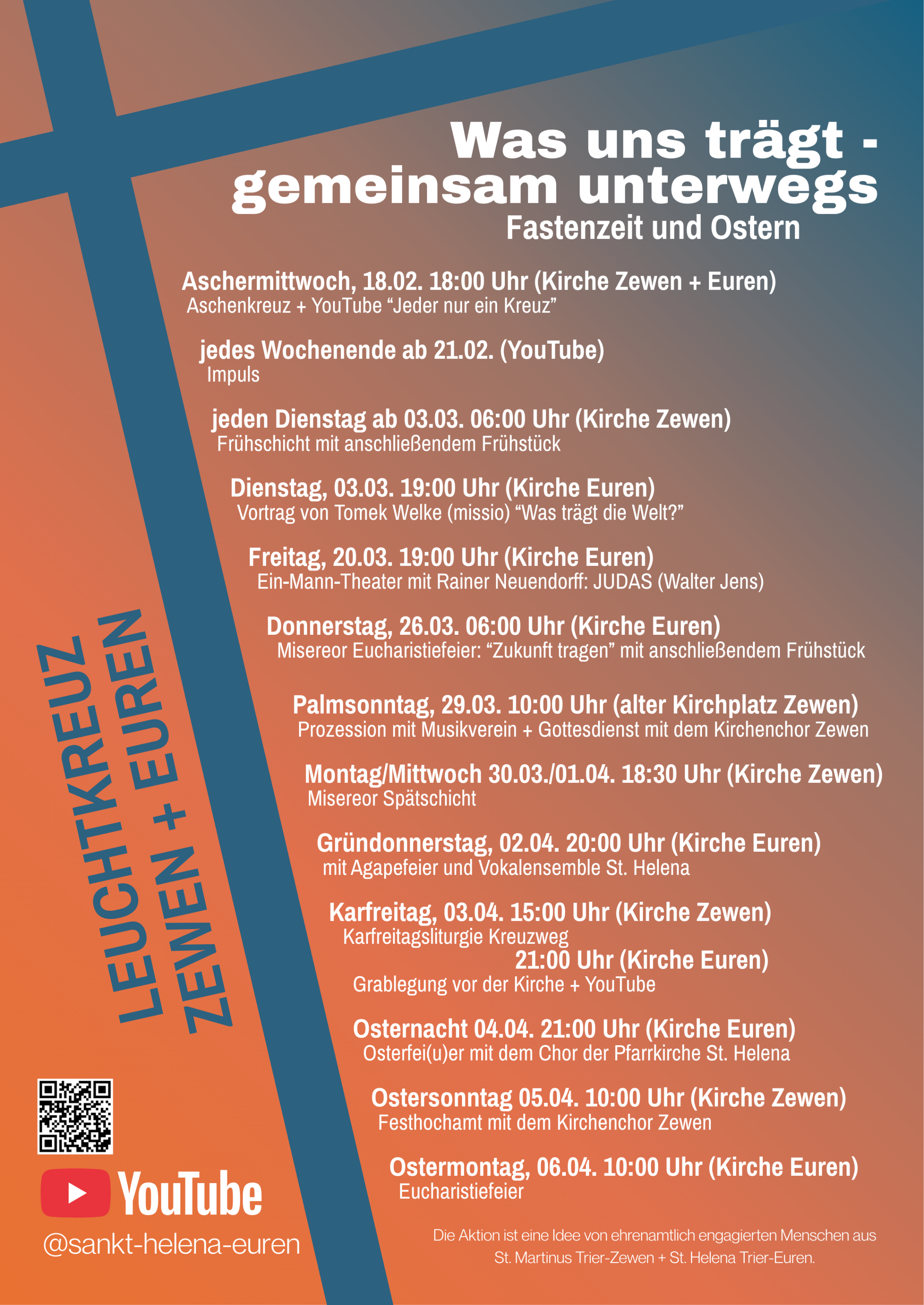 Damit verbunden ist ein Projekt, das sich Ehrenamtliche aus Euren und Zewen überlegt haben und das einlädt, sich in der Fastenzeit und während der Kar- und Ostertage mit Fragen und Themen zu beschäftigen, die etwas mit UNS und UNSEREM LEBEN zu tun haben: